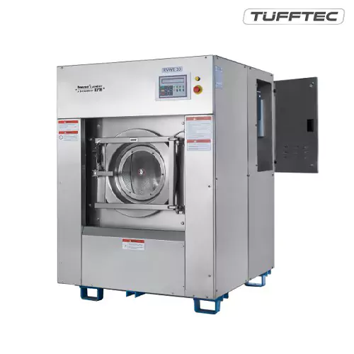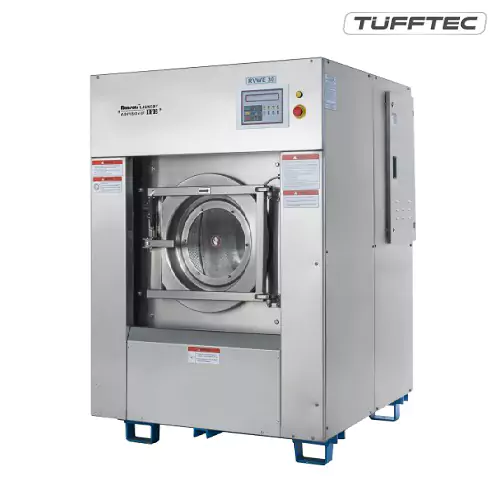 RVWE30 Washer Extractor – This Tufftec Washer Extractor is designed for professional needs. Innovative features like the LCD display makes it easy to use, select, and store wash programs. Robust stainless steel construction prevents rusting and ensures superior durability. Minimal time to fill and discharge water improves productivity and maximizes savings. Major Features Washer-Extractor – Fron Loading and Unloading High-Speed Extraction Fully Suspended soft mount types Stainless steel construction Fully Programmable PLC: Store 24 programs with large LCD Display showing complete message information of the program Pause and continue features are provided in case of a power outage. The preset programs can be easily modified. Japanese inverter drive – Single motor with visible frequency inverter drive render various speeds for washing, distribution, and low, medium, and high spin extraction, it also controls electrical peak load demands. Additional Features High Torque inverters and heavy-duty motors ensure high efficiency and low power consumption. Provided with 5-6 stainless steel chemical compartments. Safety feature Both auto and manual door lock mechanisms ensure the door stays closed during operation. Emergency stop switch Heavy-duty bearing housing and pully construction – Extremely rugged and resourceful machine for heavy-duty operations. Smooth operation with start-stop ensures the least wear and tear. Minimal time to fill and discharge water. Improves productivity and helps maximize savings.